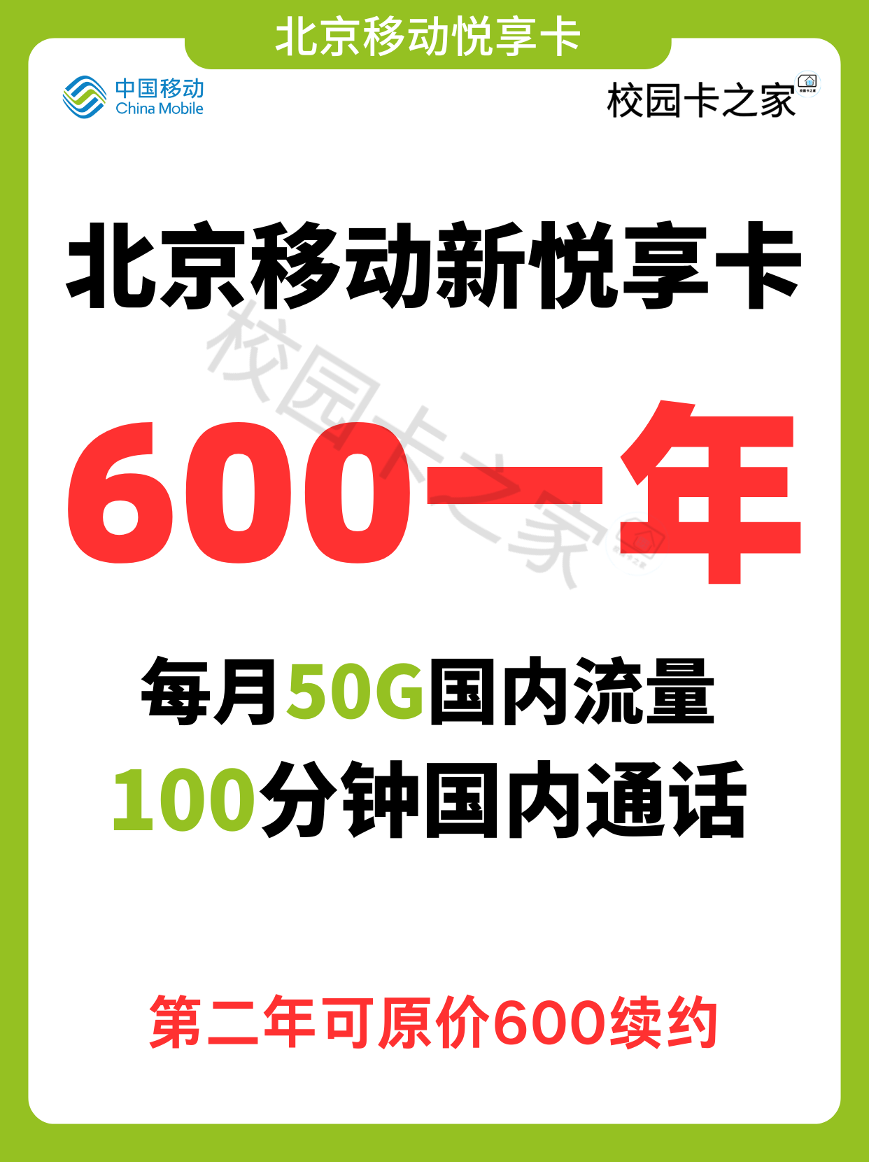 600一年每月50G+100分钟
